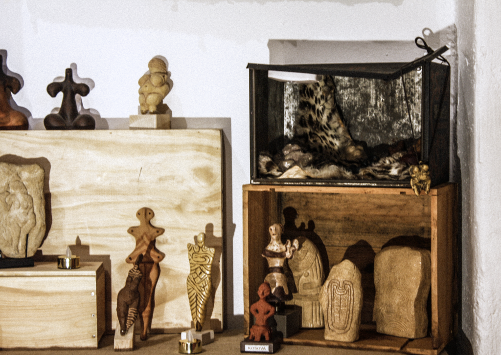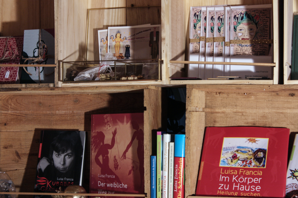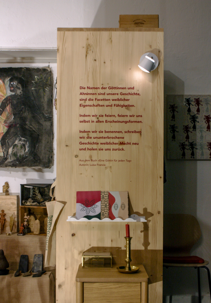Die Sammlung von Luisa Francia erhielt ein neues Zuhause. Sie zeigt eine Vielfalt von Göttinnen-Statuten und Königinnen-Figuren aus verschiedenen Zeitepochen und allen Kontinenten der Welt. Der Raum ist Ausstellung und zugleich ein Ort für Beratungen, Workshops oder kleinere Veranstaltungen. Materialien wie Jute und Holzkisten, sowie unterschiedliche Lichtstimmungen und ein klares Farbkonzept, betten die Objekte optimal ein, schaffen Nähe zu den Besuchenden und verwandeln den Raum in einen Wohlfühlort.
